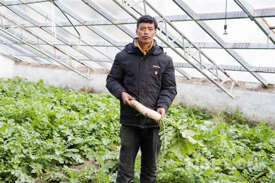 圖為定日縣長所鄉(xiāng)嘎旦村村委會主任頓珠在震后修繕的蔬菜溫室大棚內(nèi)為記者展示棚內(nèi)種植出的白蘿卜(攝于2025年4月30日) 攝影:趙振宇