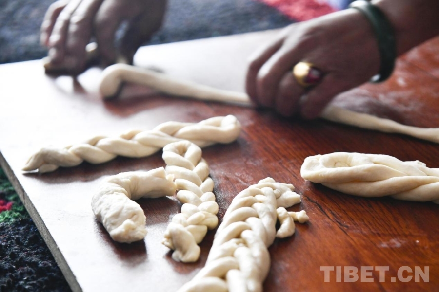 圖為薩迦縣雄麥鄉(xiāng)扎果村村民在新居內(nèi)制作傳統(tǒng)新年點心“卡塞”(攝于2026年1月6日) 攝影:趙振宇