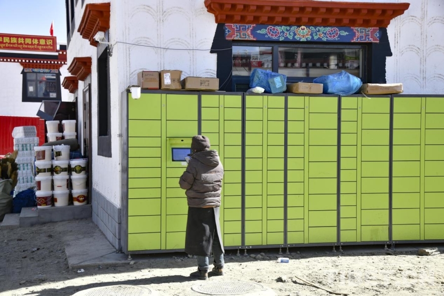 圖為定日縣長(zhǎng)所鄉(xiāng)森嘎村村民在自動(dòng)快遞柜前收取快遞。攝影:趙振宇