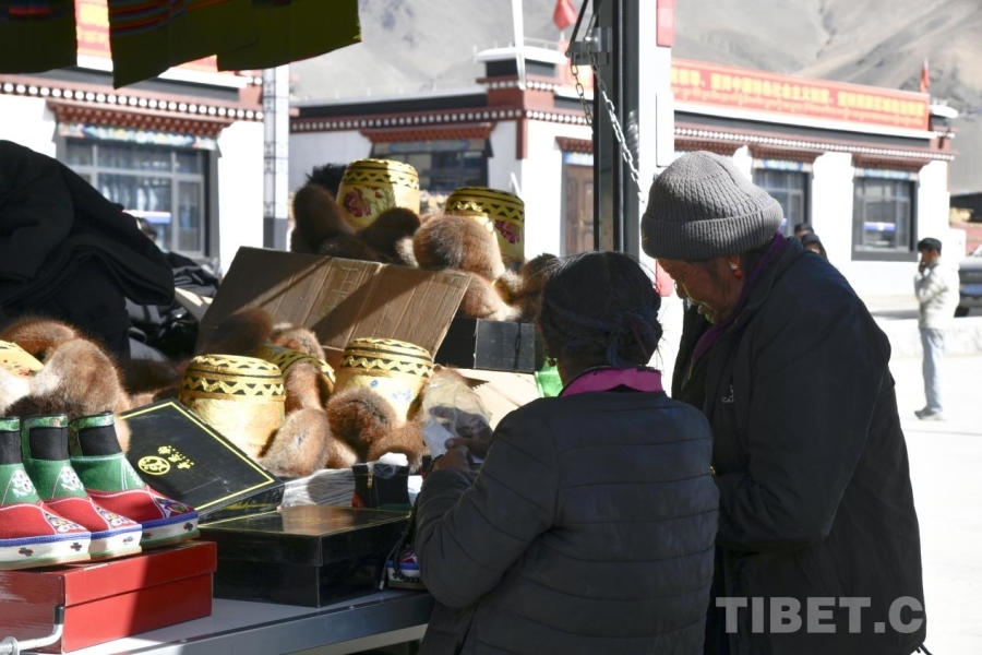 圖為日喀則農(nóng)事新年即將來(lái)臨,定日縣長(zhǎng)所鄉(xiāng)森嘎村老人在集市上挑選新裝。攝影:趙振宇
