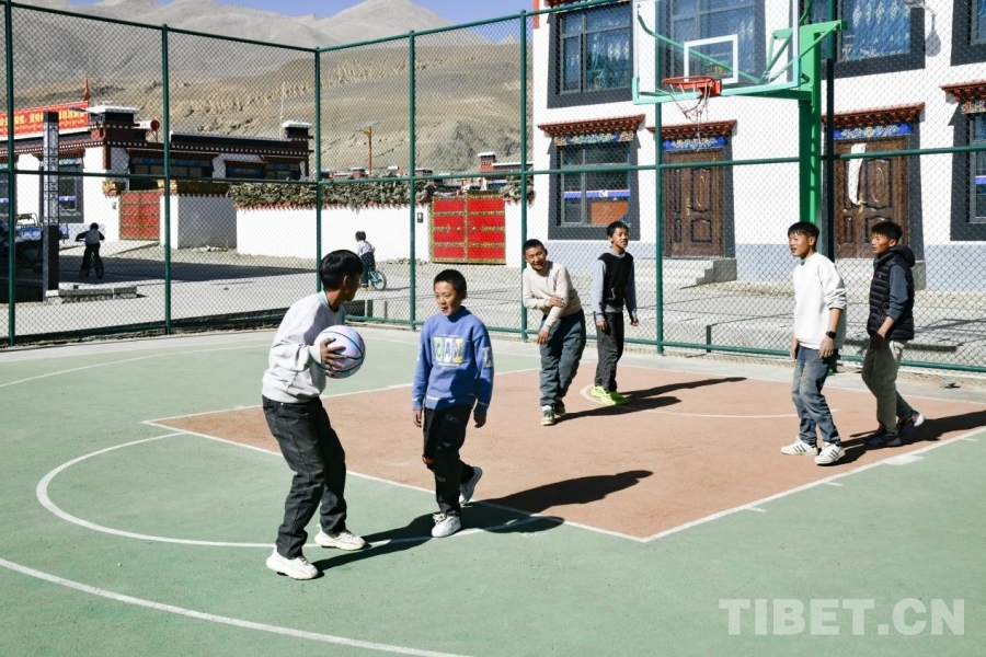 圖為在定日縣長(zhǎng)所鄉(xiāng)森嘎村的籃球場(chǎng)上,一場(chǎng)籃球?qū)Q正在開(kāi)展。攝影:趙振宇