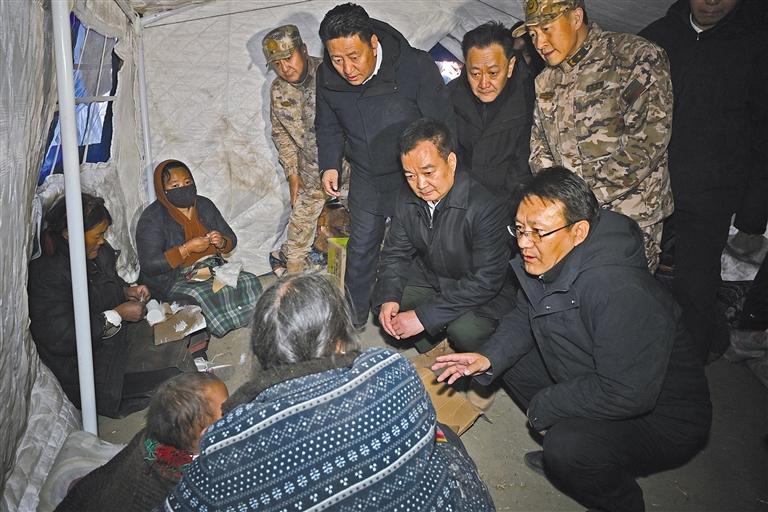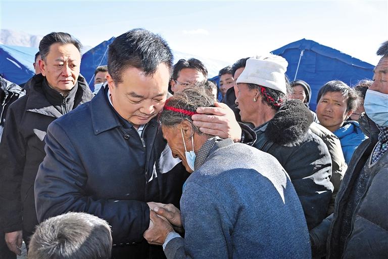 每到一處,王君正都向群眾轉(zhuǎn)達習(xí)近平總書記和黨中央、中央領(lǐng)導(dǎo)同志的關(guān)心關(guān)懷,告訴群眾相信有習(xí)近平總書記的關(guān)心關(guān)懷,我們就沒有克服不了的困難。當(dāng)受災(zāi)群眾聽到習(xí)近平總書記和中央領(lǐng)導(dǎo)同志的關(guān)心關(guān)懷,大家十分激動,許多群眾流下了感動的淚水,對抗震救災(zāi)、重建家園燃起了信心。“我們就是擔(dān)心老人孩子晚上受凍感冒?!碑?dāng)聽到災(zāi)區(qū)群眾的擔(dān)心時,王君正說:“你們的擔(dān)心正是我們的擔(dān)心。”天災(zāi)無情、人有情。在安置點上,王君正鼓勵受災(zāi)群眾堅定信心,黨和政府一定會全力以赴開展抗震救災(zāi),大家要團結(jié)一心、互幫互助,克服暫時的困難,加強統(tǒng)一規(guī)劃、重建新家園,齊心協(xié)力共建社會主義新農(nóng)村。晚上六點三十分許,海拔4400米的安置點上寒風(fēng)凜冽,看見已有帳篷陸陸續(xù)續(xù)搭建起來,王君正叮囑受災(zāi)群眾趕緊到帳篷里取暖,不要受涼受凍。他要求相關(guān)部門,要深刻認識災(zāi)區(qū)地處高海拔區(qū)域的特殊情況,把受災(zāi)群眾御寒保暖工作擺在更加突出位置,加緊調(diào)集棉帳篷、棉衣、棉被、烤火爐等物資,加快帳篷安裝進度,確保受災(zāi)群眾吃上熱飯、喝上熱水、住上帳篷、溫暖過夜、感受親情。要嚴防發(fā)生次生災(zāi)害,全面排查房屋受損情況,對嚴重受損的建筑嚴格管控,強化巡查值守,做好安全防范工作,嚴防火災(zāi),抓好衛(wèi)生防疫,配備預(yù)防流感等藥物,加強食品和飲用水衛(wèi)生監(jiān)管,堅決維護災(zāi)區(qū)社會穩(wěn)定。要充分發(fā)揮基層黨組織戰(zhàn)斗堡壘作用和黨員先鋒模范作用,落實落細黨中央和自治區(qū)抗震救災(zāi)各項安排部署,主動同受災(zāi)群眾吃住在一起,用心用情解決困難,引導(dǎo)受災(zāi)群眾開展自救、互幫互助,讓黨旗在抗震救災(zāi)一線高高飄揚。黨政軍警民要協(xié)調(diào)聯(lián)動,解放軍、武警、消防、邊檢和地方各救援力量要統(tǒng)一指揮、統(tǒng)一調(diào)度、加強協(xié)同、密切合作,齊心協(xié)力抓好抗震救災(zāi)工作。