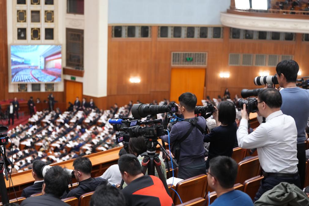 3月8日,十四屆全國(guó)人大三次會(huì)議在北京人民大會(huì)堂舉行第二次全體會(huì)議。這是記者在會(huì)場(chǎng)采訪。新華社記者 陳曄華 攝