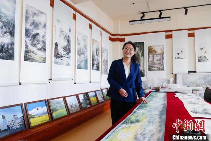 這幅彩墨山水圖出自全國(guó)人大代表、青海省海北藏族自治州門(mén)源回族自治縣第二寄宿制初級(jí)中學(xué)的美術(shù)老師郭金萍之手。