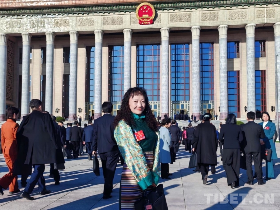 今年全國兩會期間,全國人大代表、西藏自治區(qū)社會科學院研究員白瑪措在人民大會堂前留影 受訪者供圖