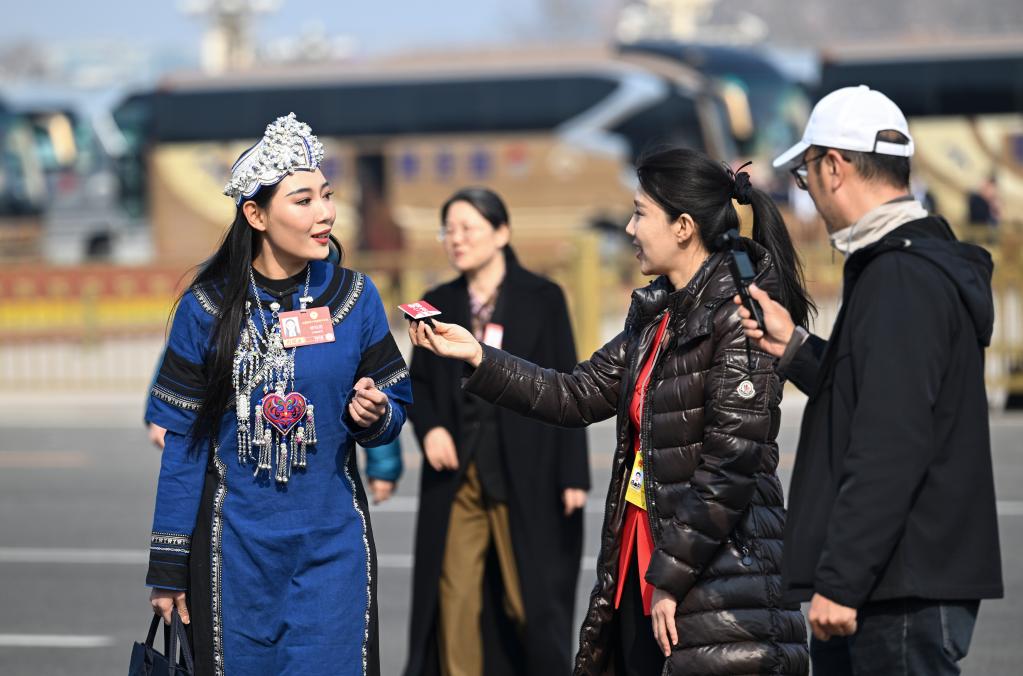 3月8日,全國政協(xié)十四屆四次會議在北京人民大會堂舉行第三次全體會議。這是記者在采訪全國政協(xié)委員。新華社記者 李賀 攝