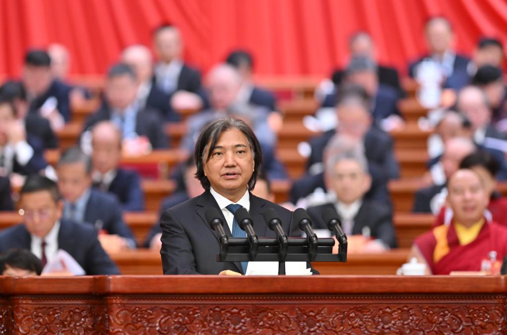 3月8日,全國政協(xié)十四屆四次會議在北京人民大會堂舉行第三次全體會議。這是班禪額爾德尼·確吉杰布委員作題為《積極推進宗教與社會主義社會相適應 為中華民族偉大復興貢獻力量》的發(fā)言。新華社記者 岳月偉 攝