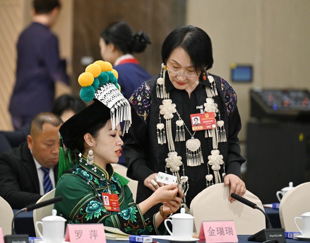 3月7日,金瑞瑞代表(前左)在十四屆全國人大四次會(huì)議云南代表團(tuán)開放團(tuán)組會(huì)議前與另一位代表交流。新華社記者 程婷婷 攝