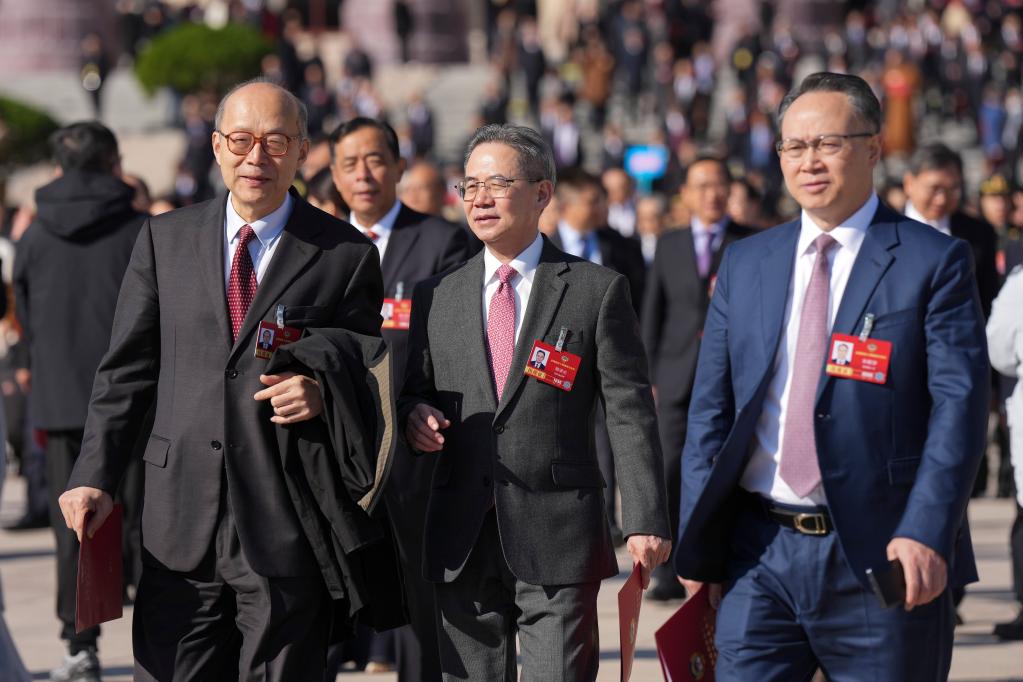 3月11日,全國政協(xié)十四屆四次會議在北京人民大會堂舉行閉幕會。這是閉幕會后,委員們走出人民大會堂。新華社記者 王曦 攝