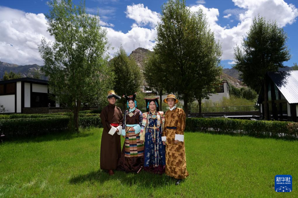 班珠丹塔(右一)和模特合影留念,模特們穿著由他設(shè)計的藏裝(9月9日攝)。新華社記者 張笑宇 攝??