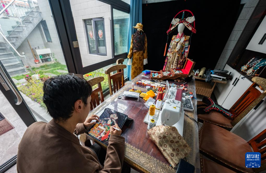 班珠丹塔在家中工作室設(shè)計藏裝(9月11日攝)。新華社記者 丁增尼達 攝?